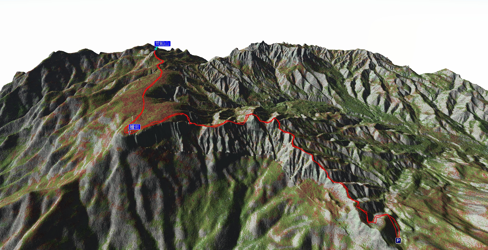 登山者駐車場(05:17)→戸隠牧場管理事務所(05:33)→一不動避難小屋(07:21)→五地蔵山(08:41)→高妻山山頂(10:52)→五地蔵山(12:32)→弥勒新道→戸隠牧場管理事務所(14:25)→登山者駐車場(14:35)